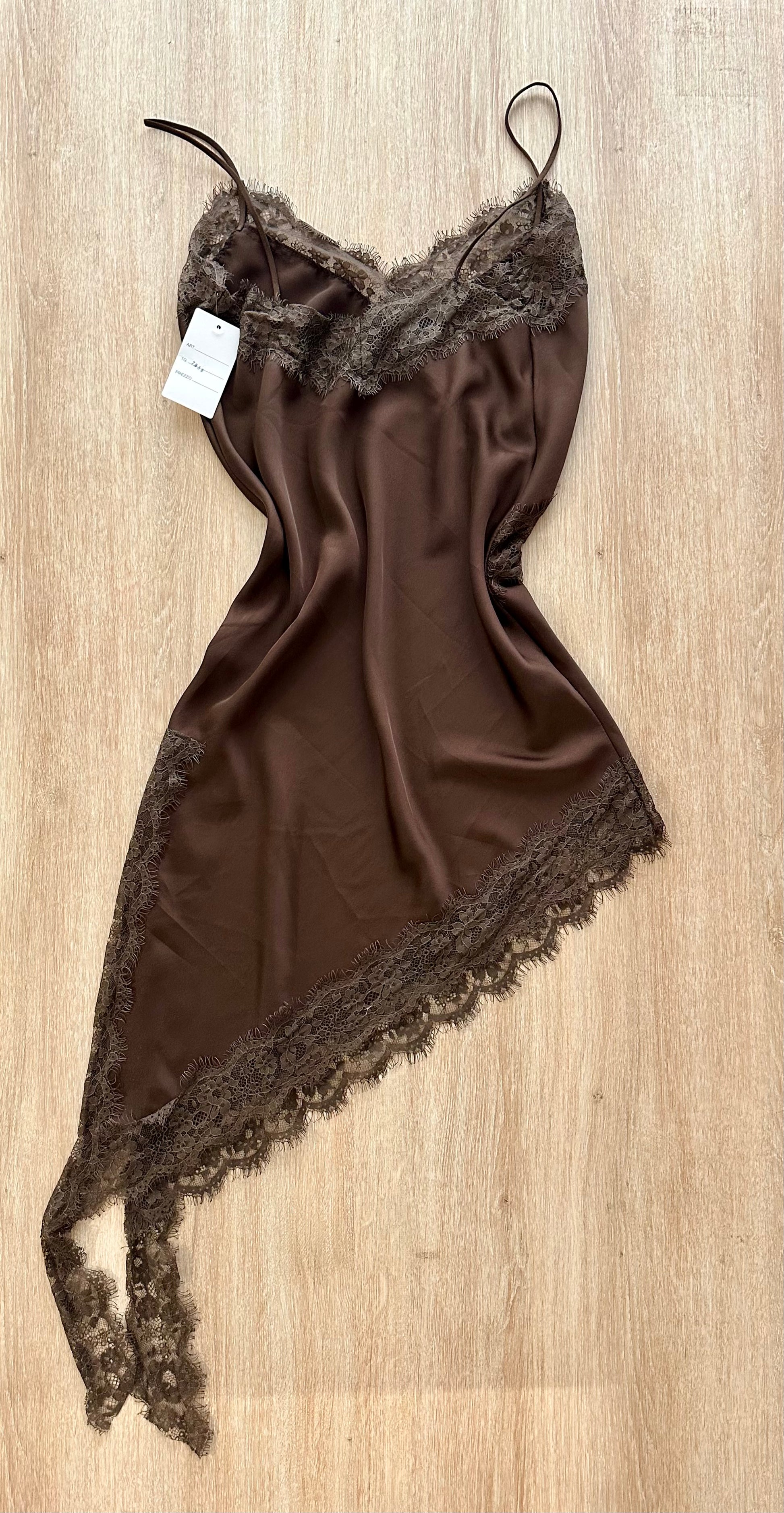 Robe satinée asymétrique à dentelles [MARRON]