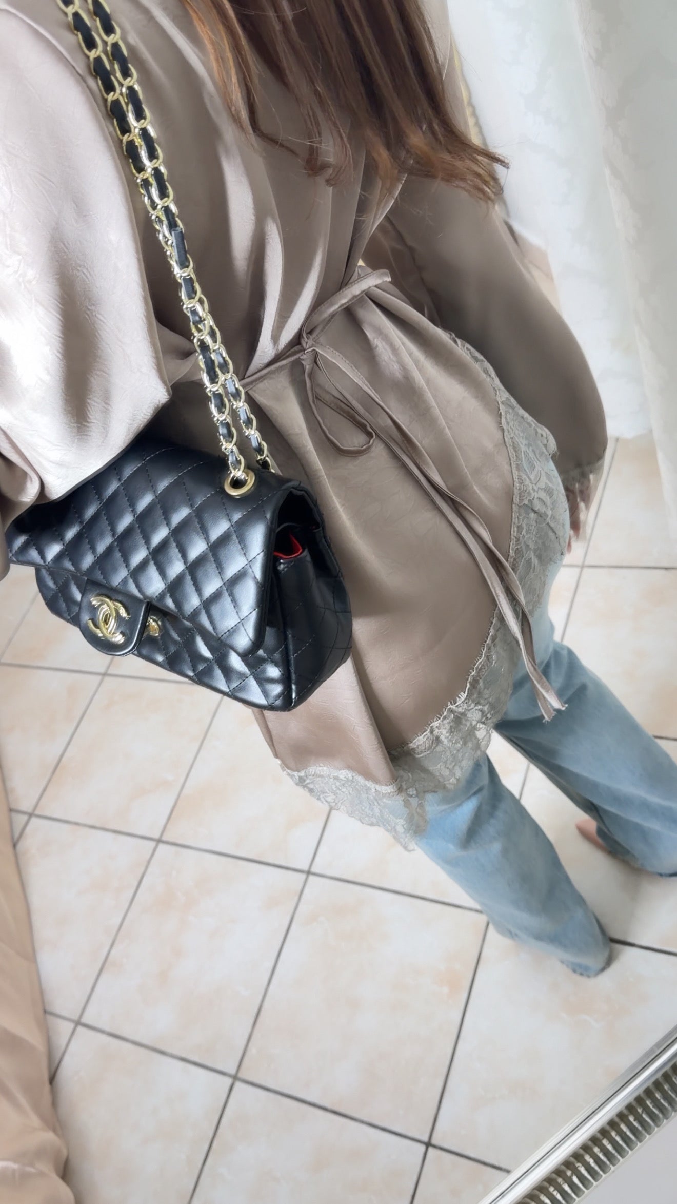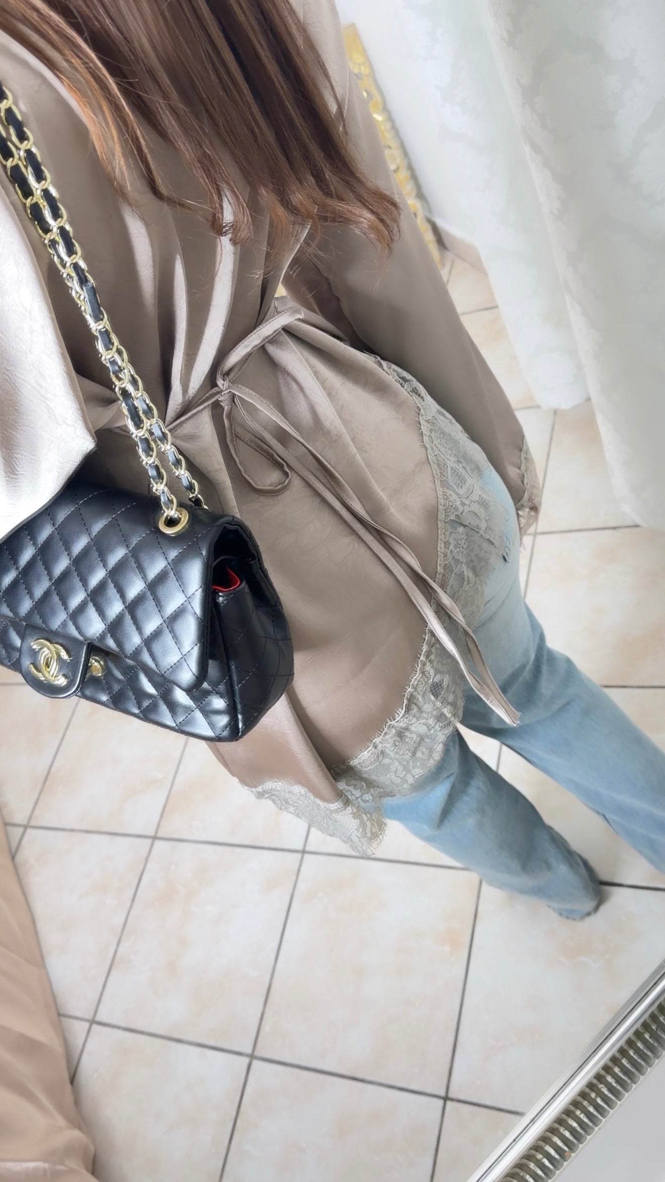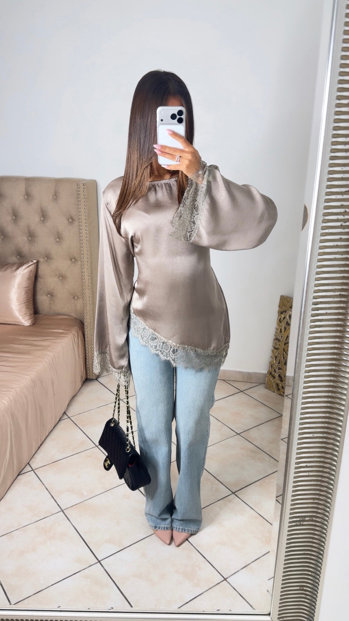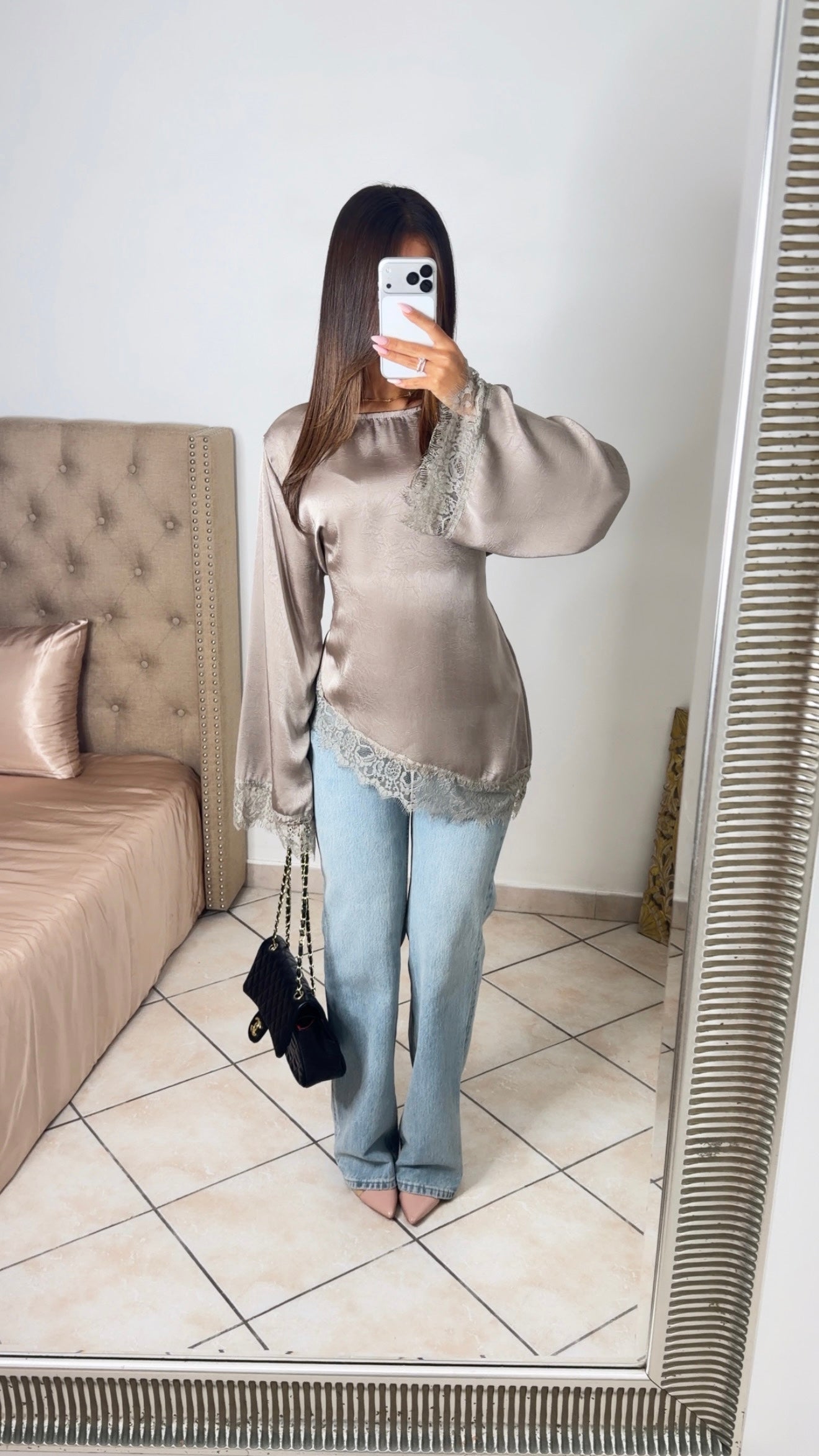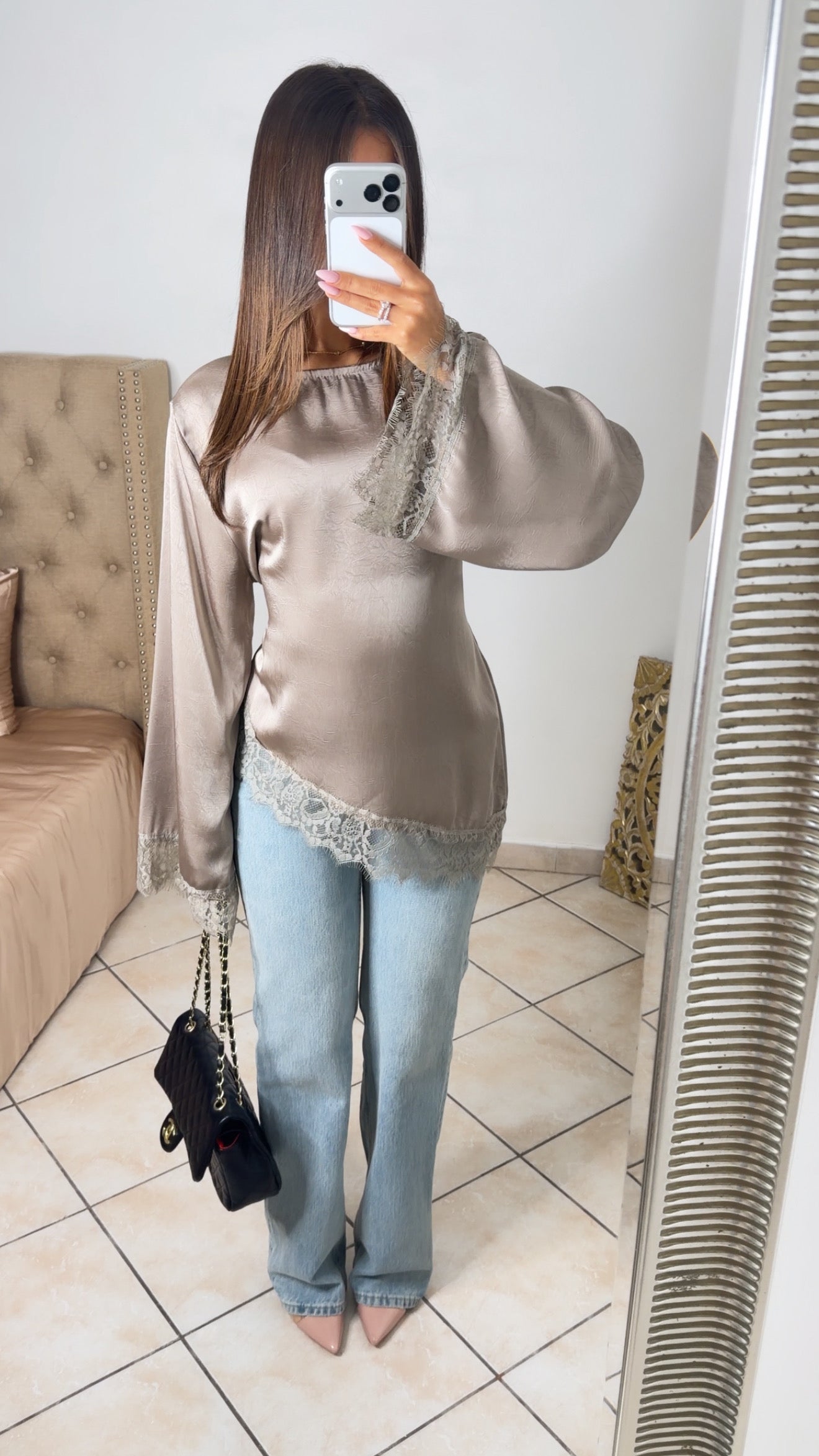 Top asymétrique à cintré satiné à dentelle [TAUPE]